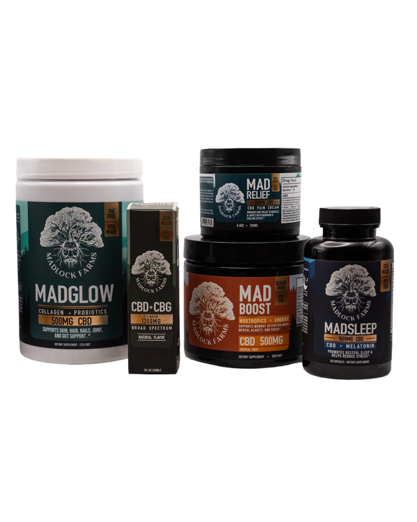 The Madlock Welcome Kit is our complete daily wellness system — five of our best-selling 0.00% THC formulas bundled together so you can support focus, calm, recovery, beauty, and sleep all in one routine. Inside you get MadBOOST, MadGLOW, MadRELIEF, MadSLEEP, and our CBD+CBG 1,350mg Oil. Each product is designed to complement the others and cover you from morning to night. It’s the fastest way to experience the full Madlock Farms difference, and it saves you $187 off buying them individually.