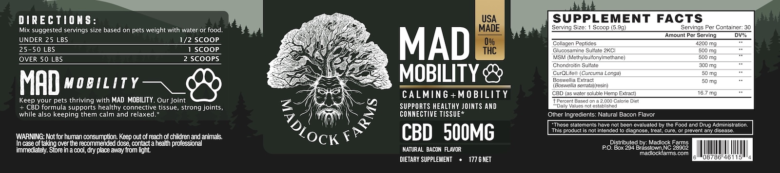 With well known supplements like Glucosamine, Chondroitin, Boswelia, and CBD, MADMOBILITY for Pets gives your pet the help it needs in reducing joint discomfort and promoting flexibility. The added benefit of 4,200 mg of collagen promotes healthy skin, fur/hair, nails, ligaments and bones in your furry friends.